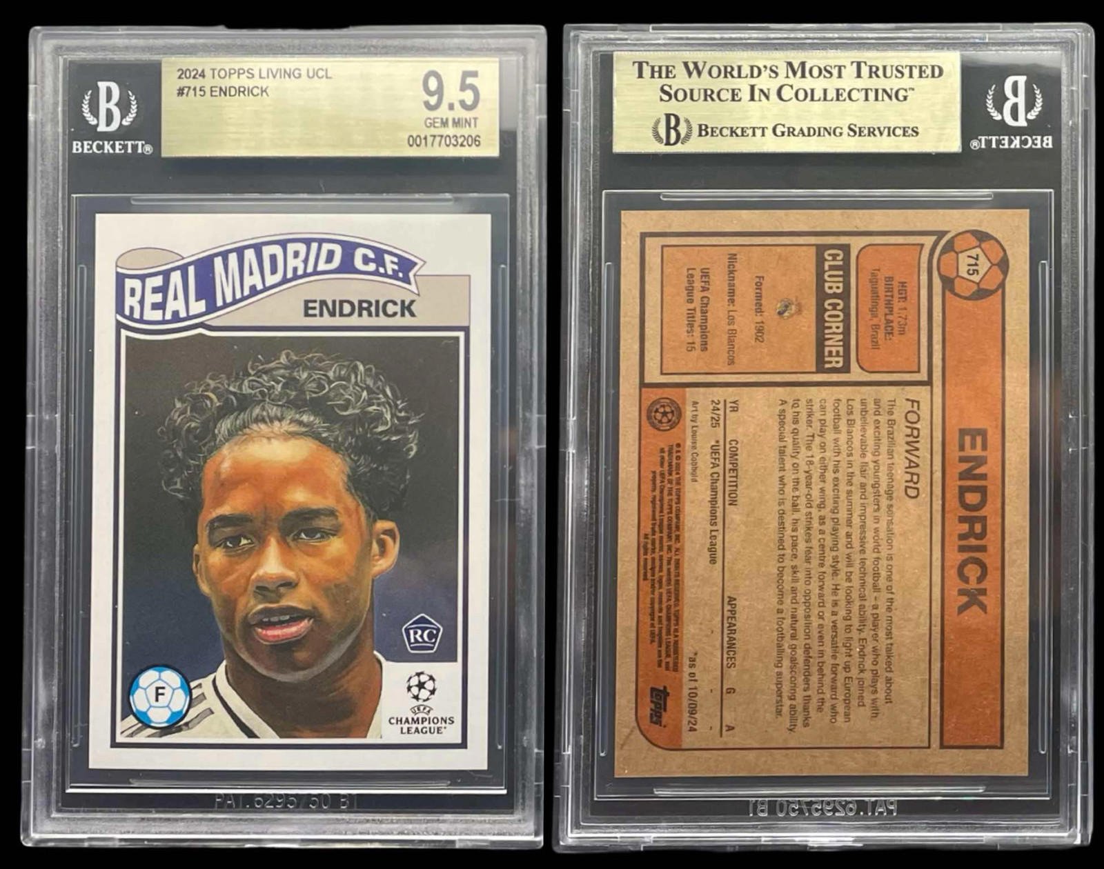 Capture a piece of soccer history with the 2024 Topps Living Set ULC #715 featuring the standout rookie, Endrick. This card celebrates the young talent's debut with Real Madrid CF, showcasing his early promise in professional football.