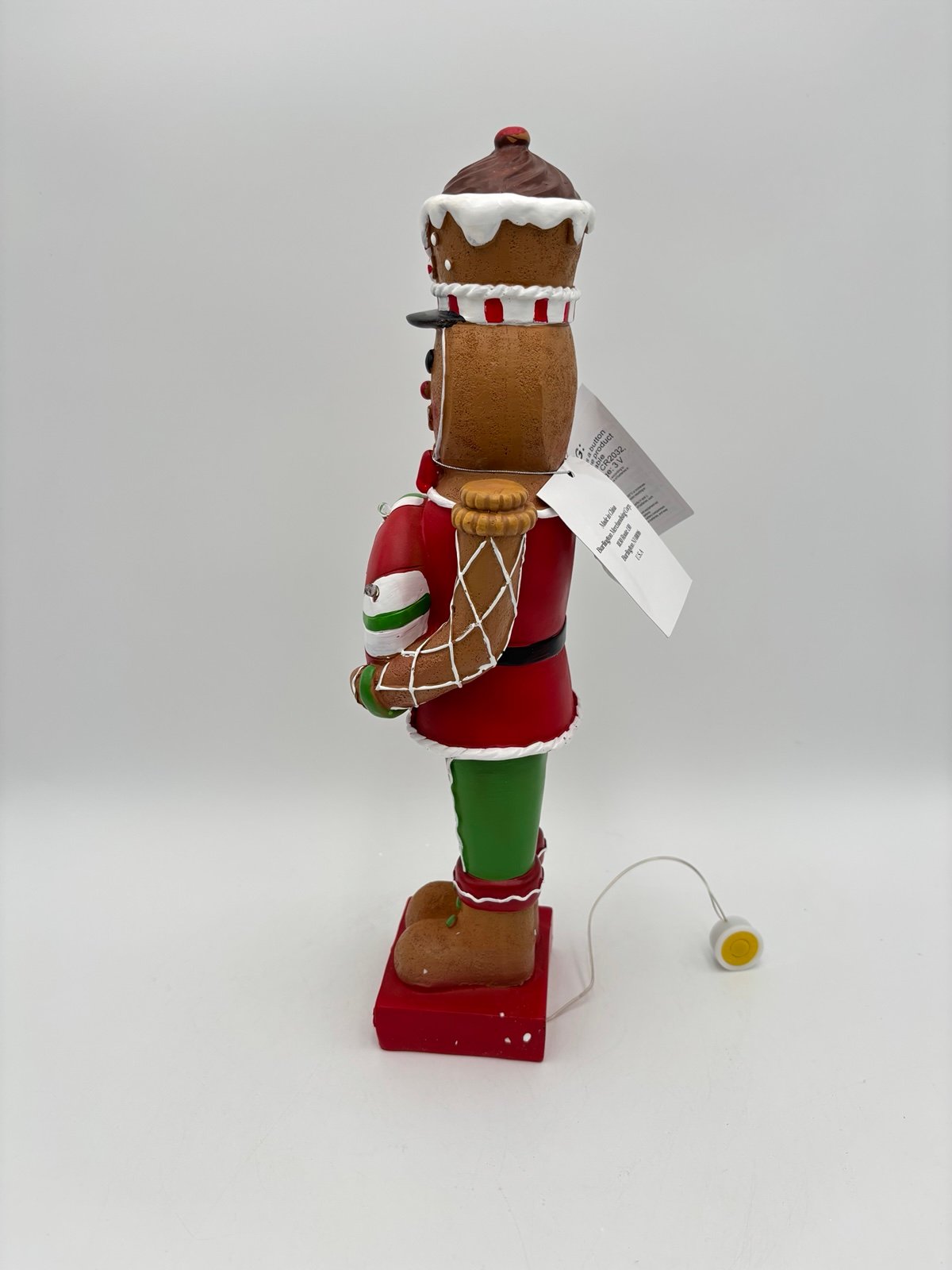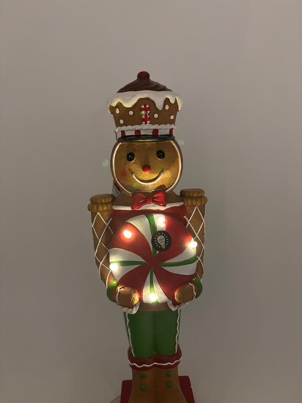 The **Adorable LED Gingerbread Nutcracker Resin Figure Holding Peppermint Decor Statue** brings a sweet twist to a classic holiday icon. Crafted from durable resin, this charming figure features a gingerbread-style nutcracker decorated with icing details and candy accents, proudly holding a peppermint swirl. With built-in LED lights that give it a cozy festive glow, it makes the perfect centerpiece or accent for your mantel, entryway, or dessert table—adding whimsy, warmth, and Christmas cheer to any space.