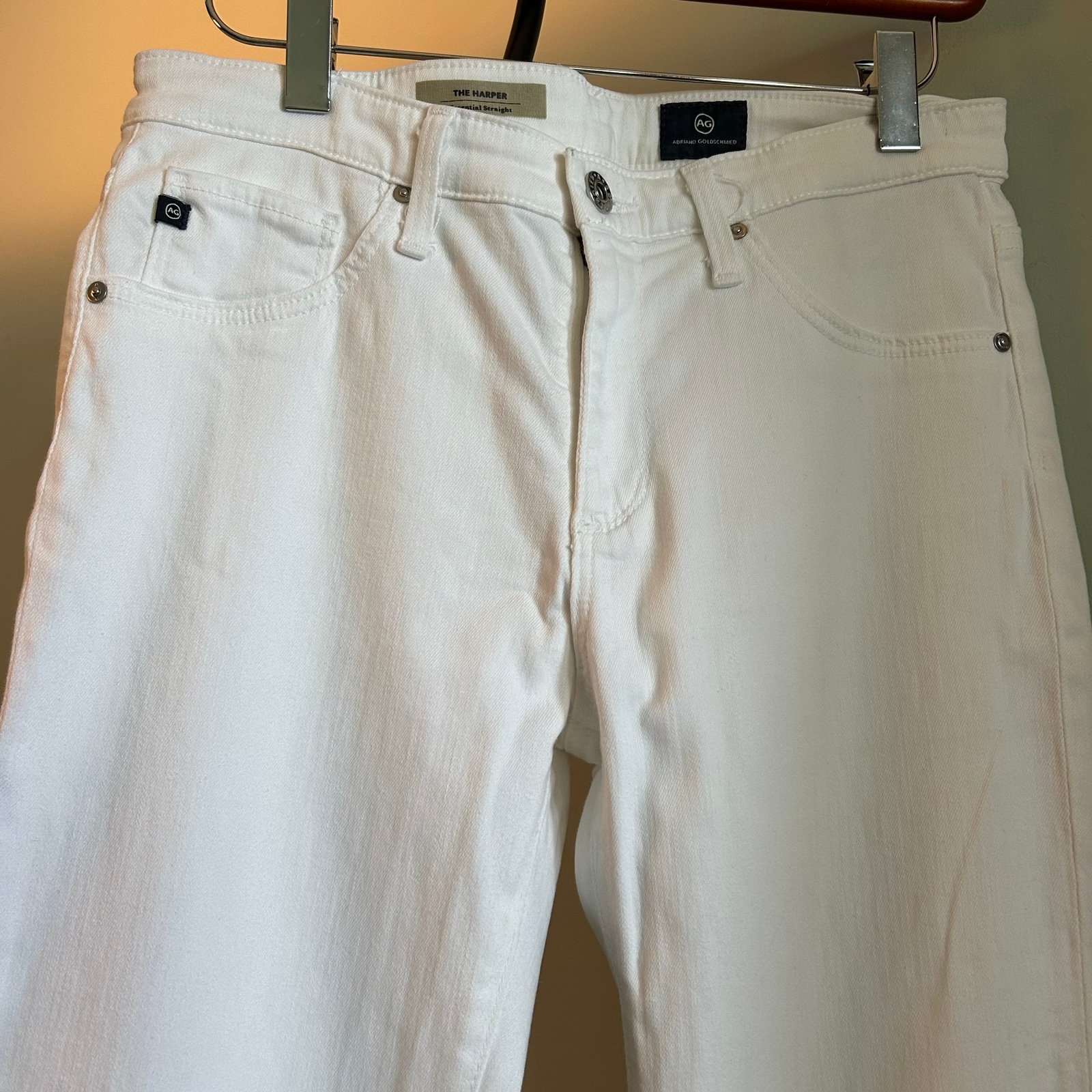 - Mid-Rise, Five Faux Pocket Zip Fly Button Closure with Belt Loops in Called The Harper Essential Straight Leg in White