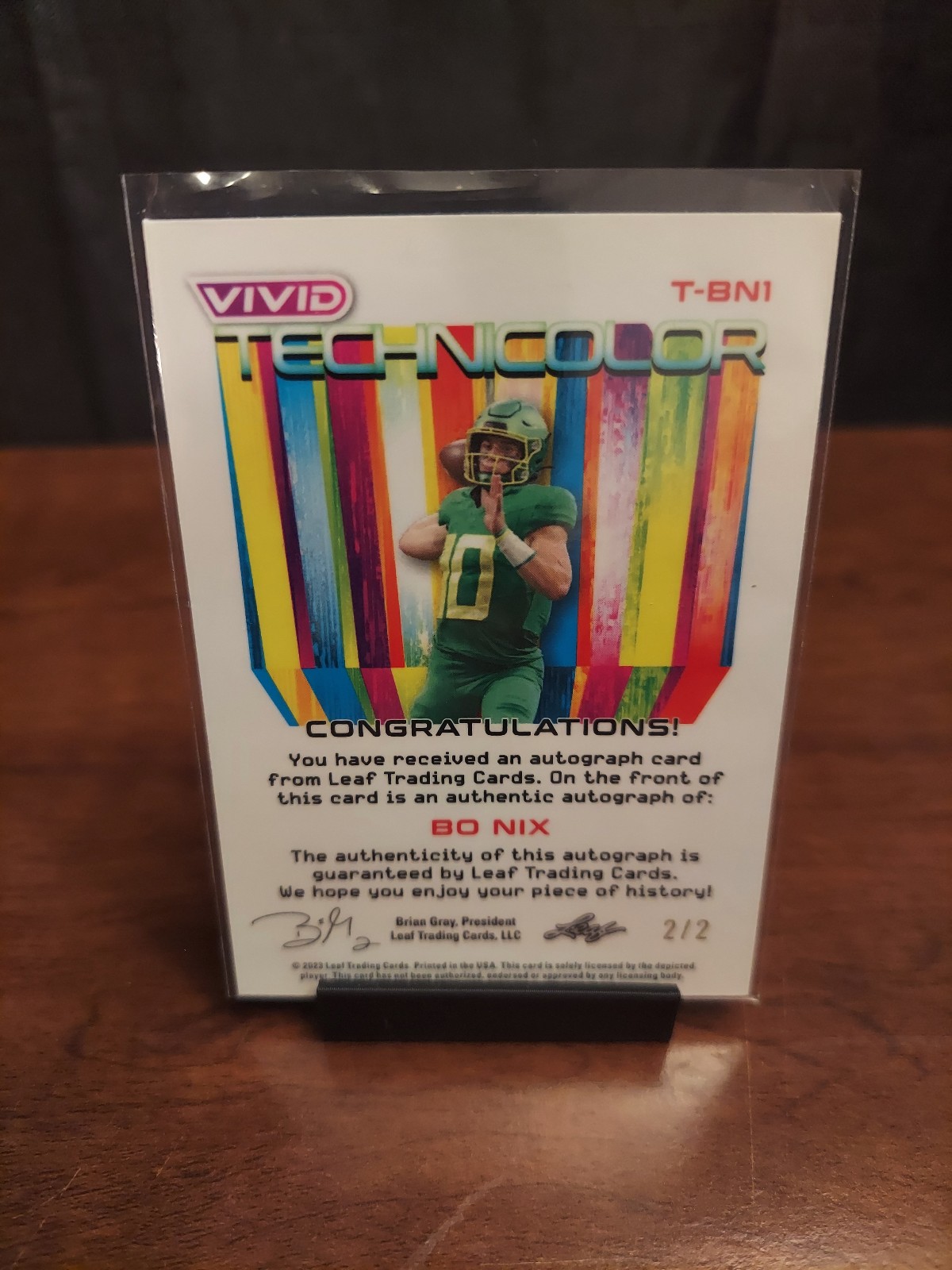Up for sale is a 2023 Leaf Vivid Technicolor Bo Nix Rookie Autograph Card, serial numbered 2/2 — a true one-of-a-kind collectible for serious fans and investors. This card features a bold on-card autograph and vibrant Technicolor design from Leaf’s premium Vivid series.
