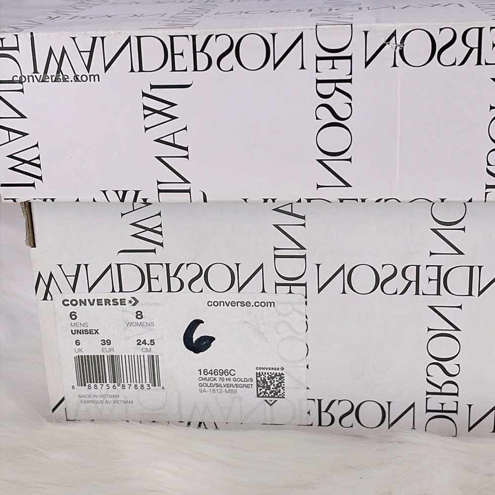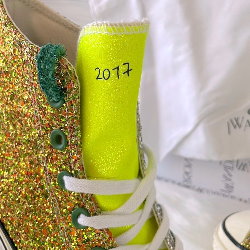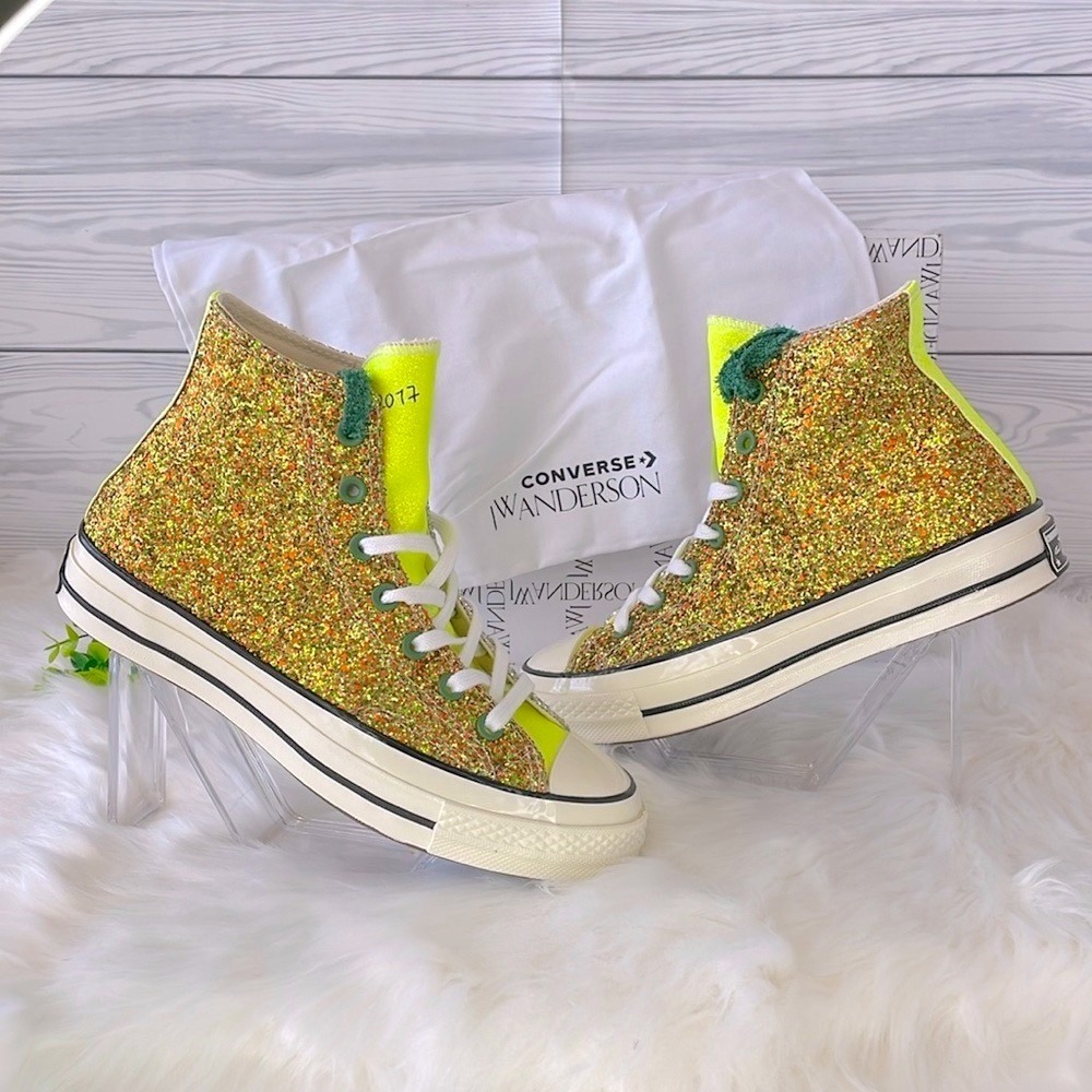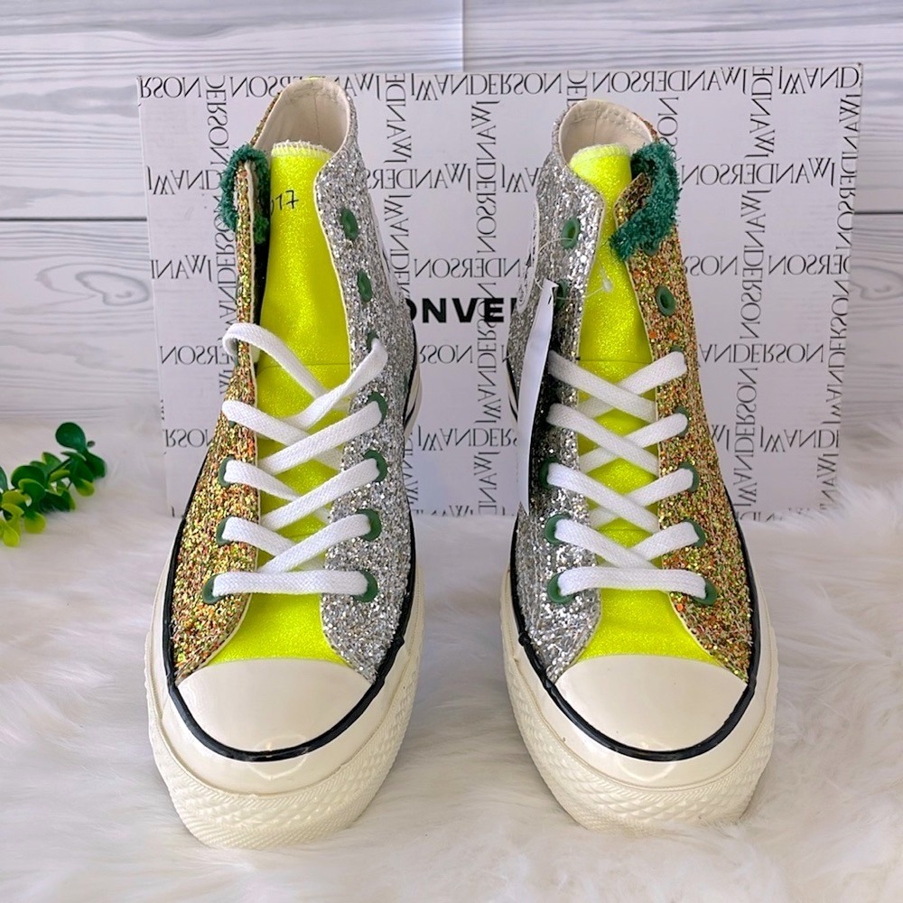 Brand New! JW Anderson and Converse hone in on glitz for the May 2019 debut of the JW Anderson x Chuck 70 High 'Glitter Pack - Gold Silver' high-top sneaker. Reinventing a renowned classic, the synthetic glitter upper takes on metallic hues with a splash of yellow at the back. Traditional laces work their way through green eyelets for lockdown while a soft canvas lining eases entry and exit. Adding detail, Converse insignias appear on the inner tongue, ankle and heel to continue the modern yet retro look. Green shoelaces and dust bag included!