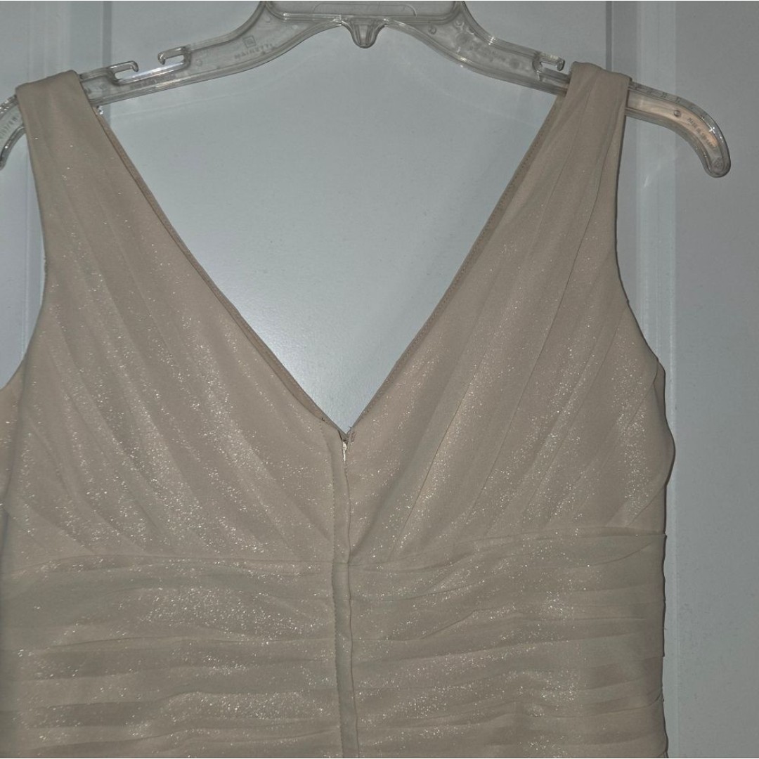 David's Bridal Formal Bridesmaid Maxi Cream Shimmer Gown Dress in a size 10. Beautiful cream/natural color with a shimmer to it when it hits the light, has sparkly beading at the neckline and a center back zipper. Excellent condition.