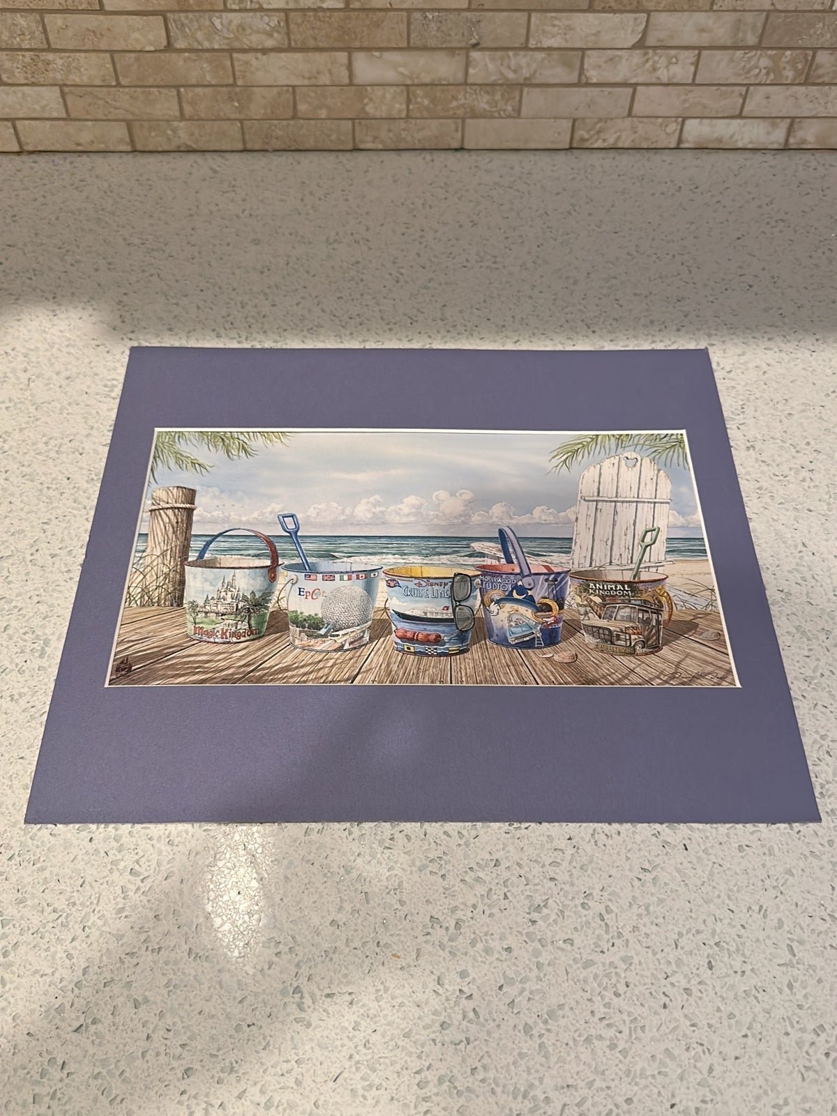 This is one of the pieces released by David Doss. It depicts 5 sand buckets on a pier behind a wooden chair with a Mickey Mouse icon cut out of the backrest. The five sand buckets feature the logos for the Four theme parks: Magic Kingdom, EPCOT, Hollywood Studios and Animal Kingdom and the Disney Cruiseline. As a finishing touch, there is a Mickey Mouse silhouette in the clouds of the background. A must-have for any collector of David Doss prints, this one is sure to sell out fast. Be sure to get yours today before they are gone.