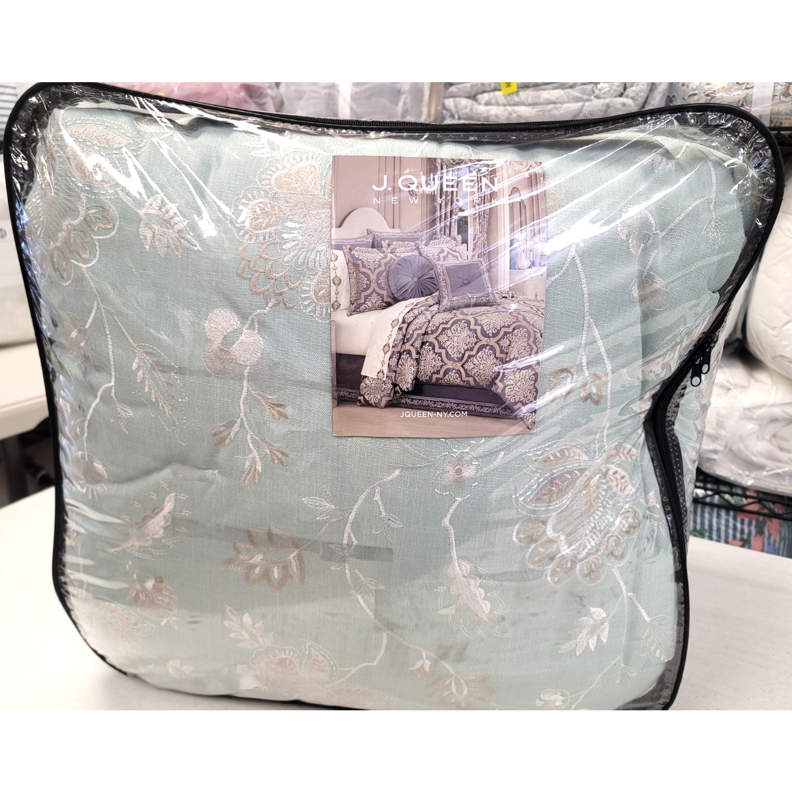 The Garden View 4 piece comforter set offers a fresh farmhouse look with a beautiful floral embroidery in neutral colours on top of a plush textured spa blue base fabric. Coordinate Garden View accent pillows, shams and window treatments by J Queen New York are available separately.
