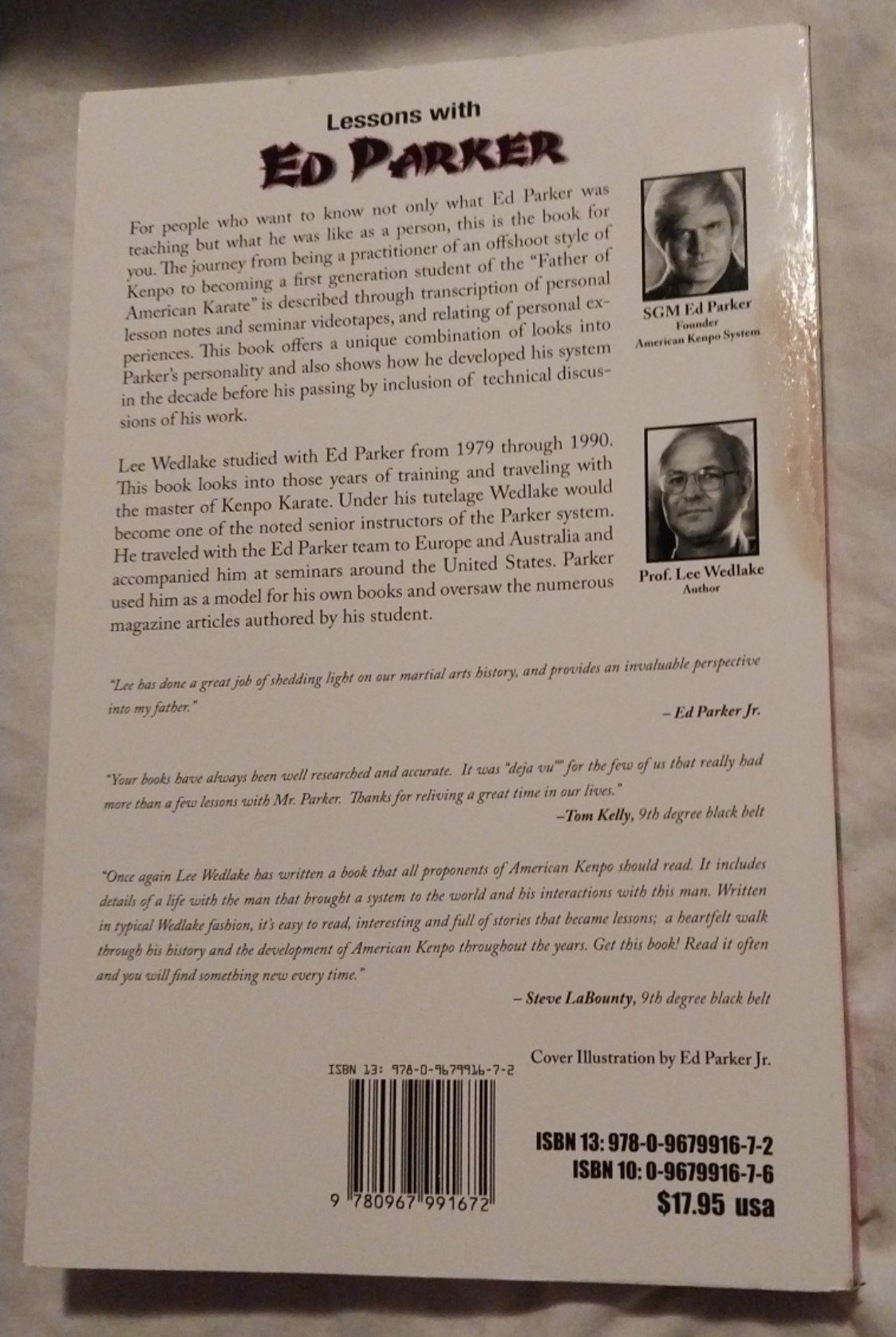 Signed copy of "Lessons with Ed Parker" by Lee Wedlake. Book has scratches on cover, small stain on back, Crisp clean pages. Printed 2009 USA