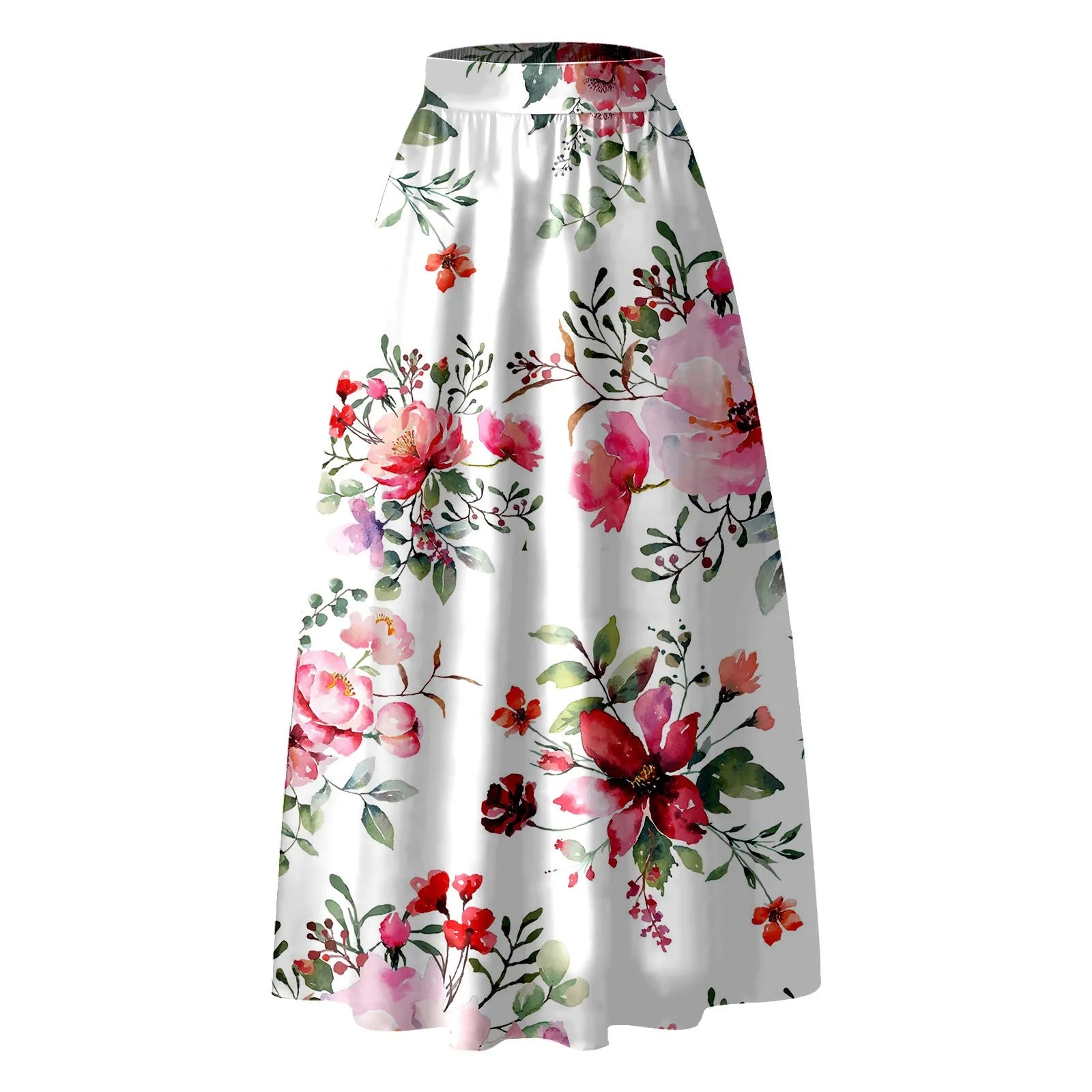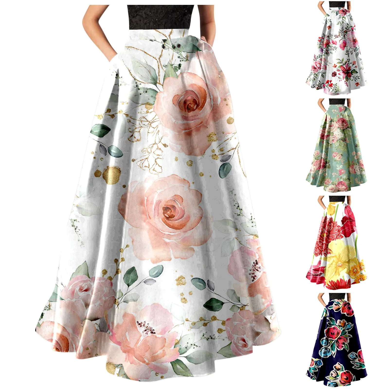Women Bohemian Floral Print Maxi Skirt High Waist Pocket Party Beach Long Skirt