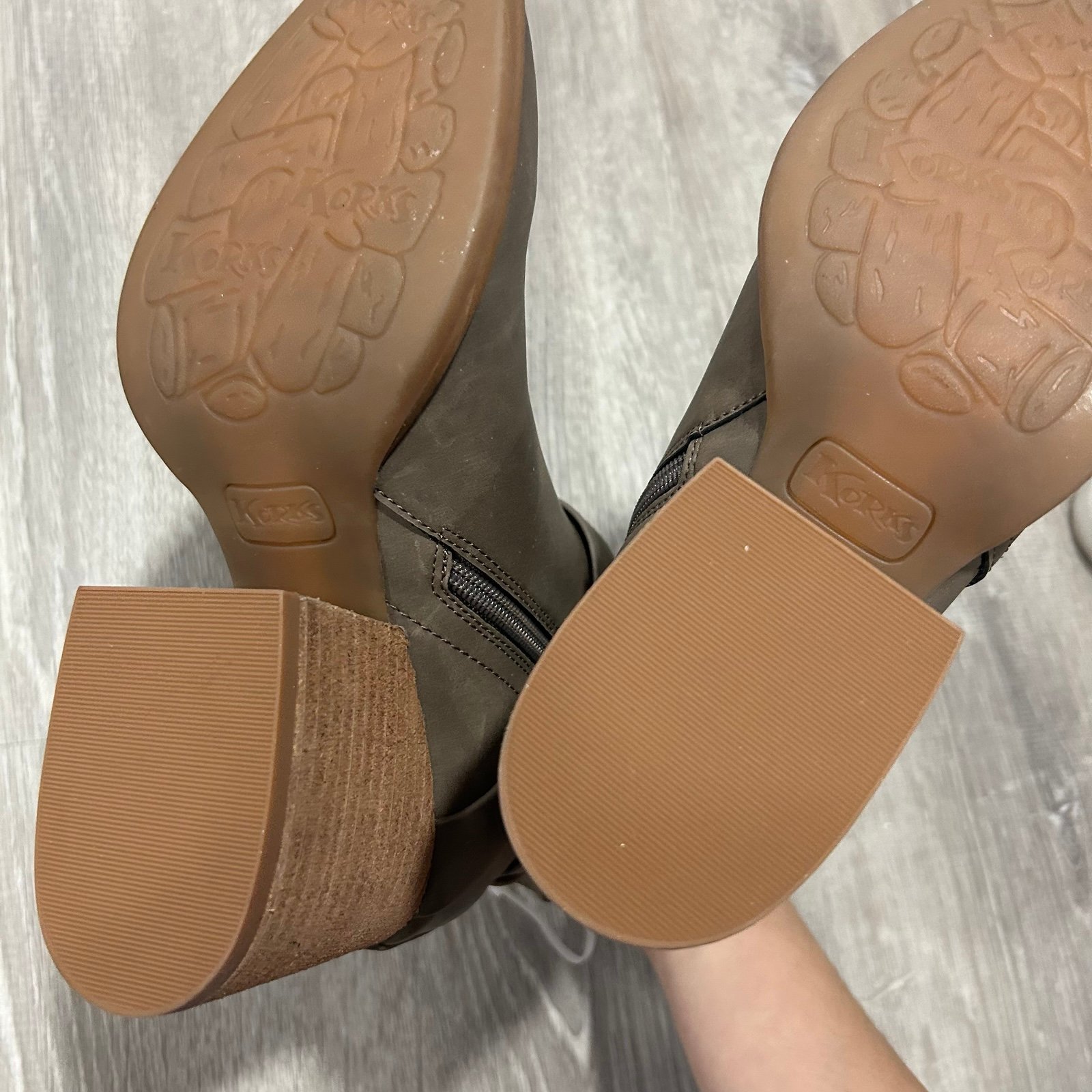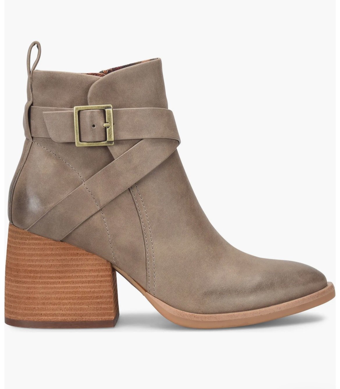 A stacked block heel lifts a smooth faux-leather bootie fashioned with a wrapped buckle strap and easy side-zip closure.