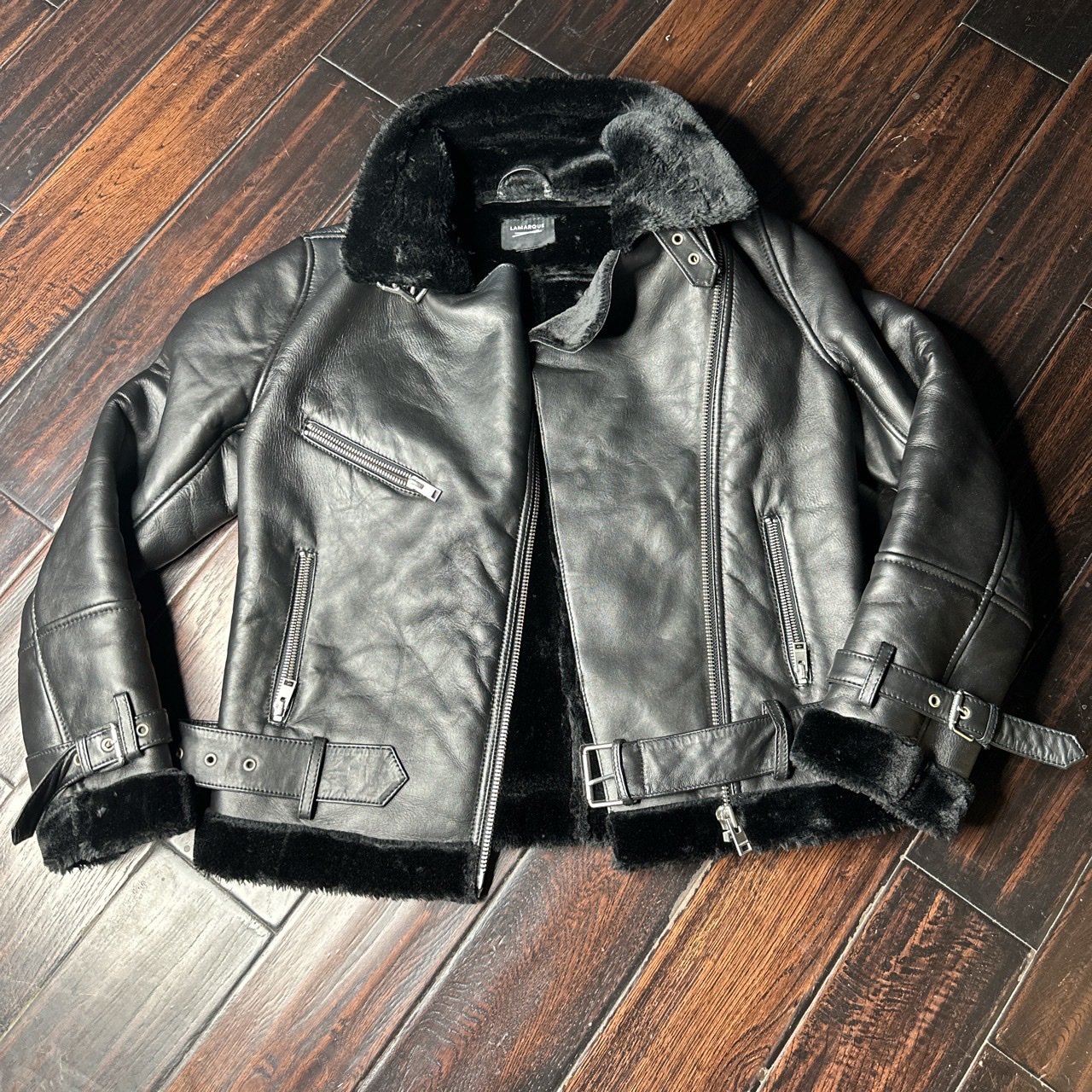 lamarque zoe leather jacket faux shearling lining. 100% REAL leather ! Nice heavy piece. Looks great and keeps you warm. This is from Saks fifth Ave.