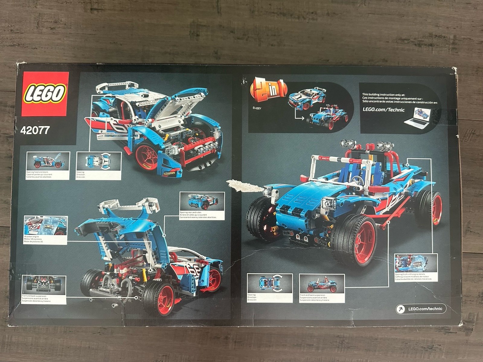 Discover awesome detail and design with this amazing 2-in-1 LEGO Technic 42077 Rally Car model, featuring sporty blue, white, red and black bodywork with racing stickers, large rear spoiler, 4 spot lamps and 6-spoke red rims with low-profile tires. This advanced builder set also features a detailed cockpit with racing seats and roll cage, 2-fan engine cooling system, opening hood and rear hatch, and a V6 engine with moving pistons. Rebuild the Rally Car to create a Buggy for a double build and play experience.