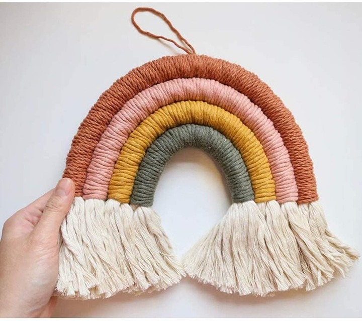 COLOR: Handcrafted Rainbow Includes 4 lines with Orange, Dusty Pink, Mustard Yellow and Greyish-green, elegant and universal, this macrame rainbow wall hanging is a good choice for seasonal and holiday decorating, or the finishing touch to a child's room or nursery.