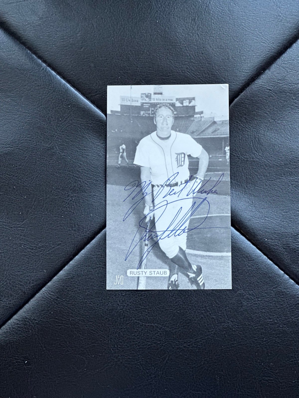 Authentic signature by Rusty Staub - great photo of the old Detroit stadium as well. Rusty’s restaurant authentic back. Aged beautifully singed in front of me 1980