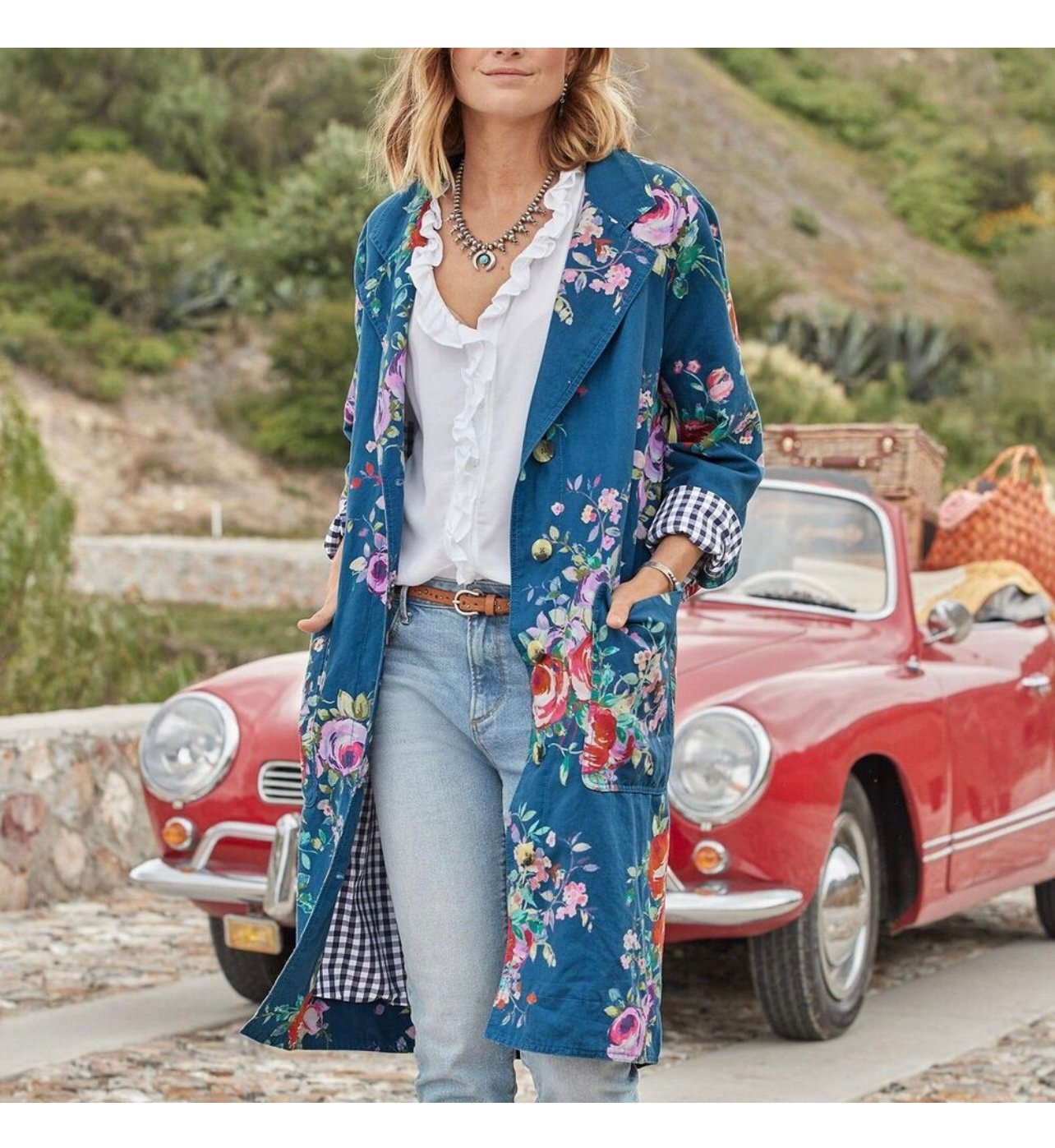 * floral printed topper featuring gingham lining.