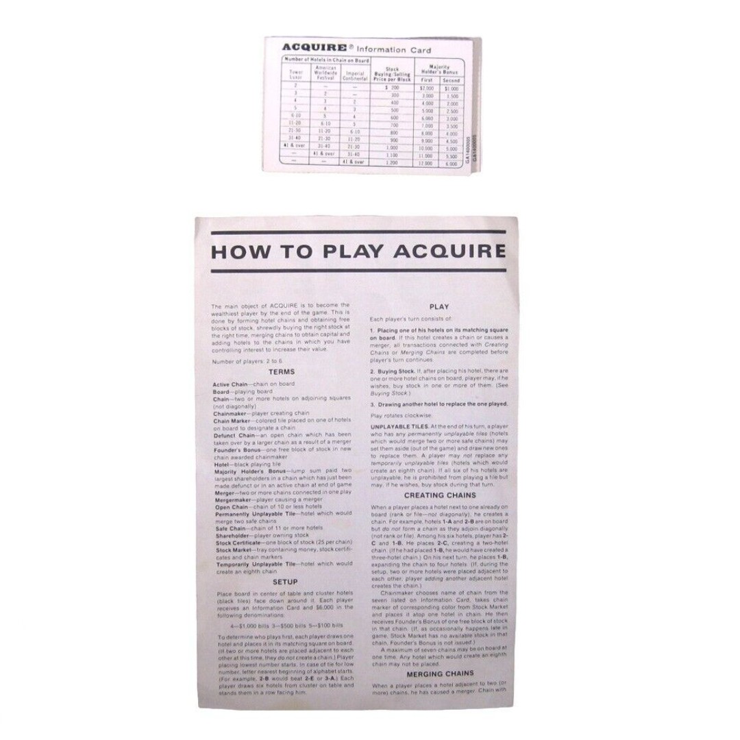 Here is a vintage Acquire game, a Bookshelf Game from Leisure Time Games, for 2 to 6 players. The box says it's for all ages, but most users seem to think that age 12 and up is more realistic. The copyright date on the front is 1976. This game is complete with all parts:
