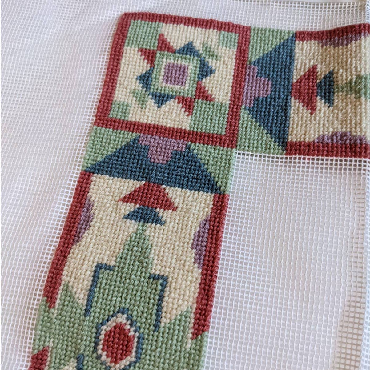Vintage Counted Needlepoint pillow kit from Candamar Designs from the 1980's featuring a desert landscape with an opuntia cactus surrounded by a southwestern border. The majority of this kit has been completed already. It would appear that there is still some work on the border that needs to be finished before it can be assembled.